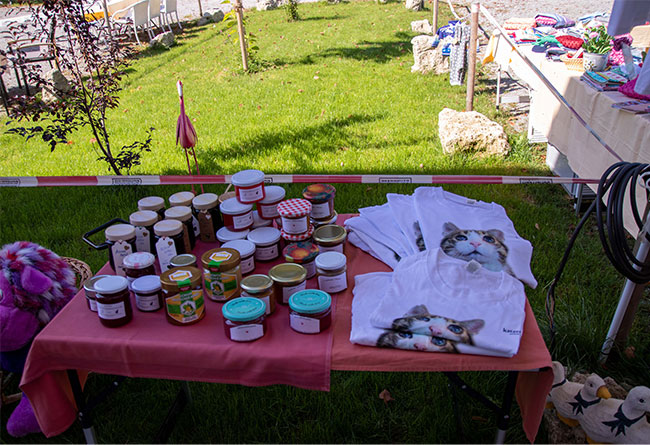 Zur selben Zeit herrscht noch Ruhe im Gnadenhof, erst um 06:30 Uhr melden sich hungrige Mäuler und warten auf ihr Frühstück. Irgendwie merkt man den Miezen an, dass auch für sie heute ein besonderer Termin ansteht. Nala putzt eifrig ihr Fell, sogar Fritzi bleibt kurz wach. Viele fleißige Hände sind da, bauen Stände auf, richten die Kuchentheke, überall wird bei bester Stimmung gearbeitet und geputzt. Unserer „Katzenfinderinnen“ versuchen, alle Katzen schon mal ausfindig zu machen, auch wenn sich die meisten bestimmt gleich wieder andere Plätze suchen.