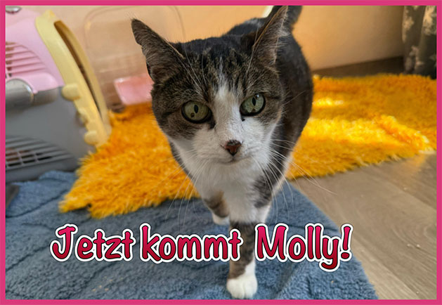 Wie die ersten Untersuchungen ergaben, ist Molly gesund, die beiden Flecken in den Augen sind unbedenklich. Noch ist sie in der Quarantänestation, doch bereits hier zeigt sich, dass Molly eine riesengroße Schmuserin ist. Und wir finden, ein kleines bisschen Wohlstandsbäuchlein darf bei einer älteren Dame durchaus sein.