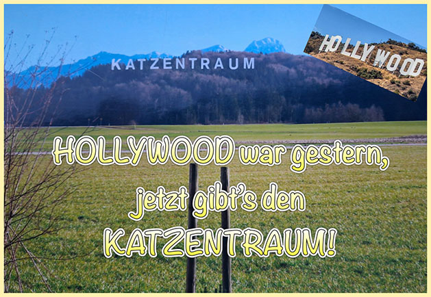 103 Jahre nachdem in Los Angeles der weithin sichtbare Schriftzug Hollywood angebracht wurde, konnten wie am heutigen 1. April endlich den Schriftzug KATZENTRAUM an den Hängen des Irschenbergs einweihen!
