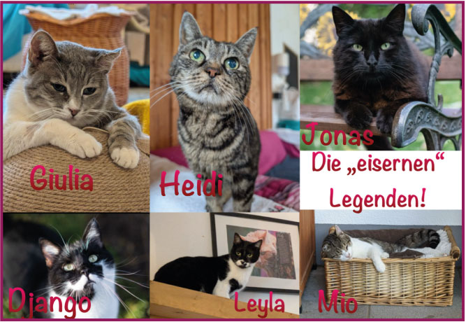 Das waren sie, unsere sechs „Eisernen“, die bei uns schon zum Inventar gehören und nicht mehr wegzudenken sind. Und gerade wenn das Schicksal wieder gnadenlos zuschlägt und eine Mieze schon in jungen Jahren gehen muss, finden wir Trost im Kreis unserer schon seit langer Zeit ans Herz gewachsenen Schützlinge.