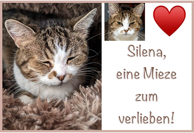 Wie uns berichtet wurde, drohte Silena nun der Tod, denn sie landete in einer Tötungsstation und damit wäre ihre Geschichte eigentlich zu Ende gewesen. Doch eine Tierschützerin wurde auf die völlig ausgehungerte Mieze aufmerksam, rettete sie und fragte bei uns um Aufnahme nach. So zog die kleinwüchsige Kätzin im März 2023 bei uns ein. Da sie aufgrund ihrer schlimmen Vergangenheit unter Arthrose leidet, bekommt sie monatlich eine Solensia-Injektion verabreicht, so werden eventuelle Schmerzen gelindert. Wobei immer wieder erstaunlich ist, welch große Essensportionen Silena verdrücken kann, dabei hat sie keine Zähne mehr was aber offensichtlich kein größeres Problem darstellt.