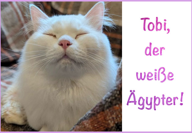 In diesem Monat hatten wir wieder einen ganz besonderen Neuzugang, den weißen Ägypter Tobi. Schneeweiß, molliges Langhaar, ein richtiger Knuddelbär. Er ist etwa fünf Jahre jung und könnte, wenn der Farbunterschied nicht wäre, ein Zwillingsbruder von Ramses sein. Leider hat er auch ein ganz ähnliches Problem, seine Hinterbeine sind gelähmt.