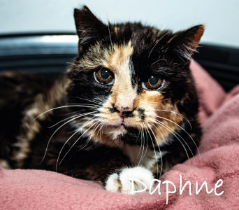 Daphne kam zusammen mit ihrem mittlerweile verstorbenen Gefährten Franzl aus NRW. Dort lebte sie in einem Schrebergarten und wurde von einem Katzenhasser mit dem Tode bedroht. Da ihr Beschützer wegzog, brachte er beide Katzen zu uns. Daphne war lange extrem scheu und traute sich nur nachts aus ihrer Behausung. Erst nach etwa 12 Monaten verließ sie ihren geschützten Raum im 1. Stock und legte die große Scheu ab. Mittlerweile ist sie auch oft im Garten unterwegs und fühlt sich sichtlich wohl. Daphne ist sehr sozial, kommt mit allen Miezen gut zurecht und lässt sich jetzt sogar streicheln.