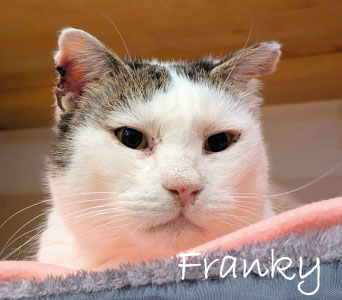 Franky lebte in einer Streunerkolonie auf der griechischen Insel Mykonos. Bei einer Kastrationsaktion wurde eine bösartige Veränderung an einem Ohr festgestellt, Grund ist sicher die starke Sonnenstrahlung. Franky wurde operiert, ein Teil des Gewebes wurde entfernt. Er ist ein ganz lieber Kater, sehr sozial und zufrieden. Schläft gerne oder ist im Garten unterwegs. Lässt sich streicheln und versteht sich mit Allen.