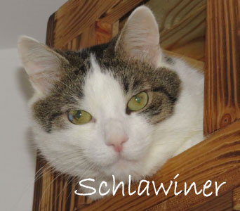 Über sein „Vorleben“ ist wenig bekannt, eine Tierfreundin holte ihn aus der Katzenobhut Baumburg. Der sehr liebe Kater wurde leider sehr krank, zwei Überdehnungen im Dickdarm mussten operativ behandelt werden, dazu wurde sein Dünndarm verkürzt. Da eine Dauerbehandlung im Raum stand, war seine Besitzerin wegen privater Probleme finanziell überfordert, so kam Schlawiner zu uns.
