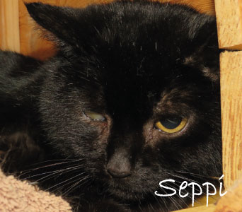 Seppi hat ein langes Streunerleben hinter sich. Er bettelte immer wieder bei einer Tierfreundin um etwas Futter, weigerte sich trotz der Kälte aber ins Haus zu kommen. Da sich ein Auge entzündete, wurde Seppi mit einer Lebendfalle gesichert und darf jetzt bei uns bleiben. Er ist aber noch extrem ängstlich und muss sich erst zurechtfinden.
